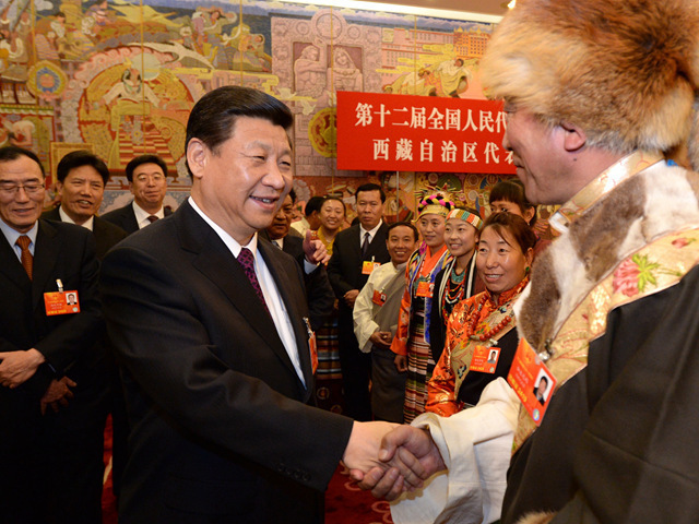2013年3月9日,中共中央总书记、中共中央军委主席习近平参加十二届全国人大一次会议西藏代表团的审议。这是习近平同代表亲切交谈,右二为格桑卓嘎。(新华社记者 马占成 摄)