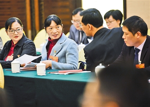 3月3日,人大江西代表团举行全体会议。陈隆梅代表(左二)就自己将要提交的建议与同团代表进一步交流。