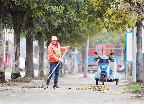 2月28日,陈隆梅代表在赣州市南康区大街上清扫路面。