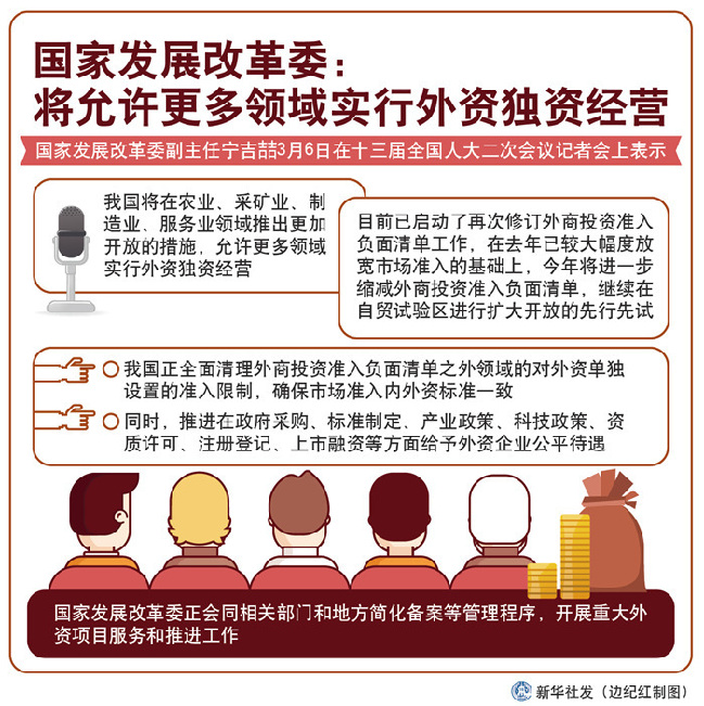 新华社北京3月6日电(记者孙奕、谭谟晓)国家发展改革委副主任宁吉喆6日在十三届全国人大二次会议记者会上表示,我国将在农业、采矿业、制造业、服务业领域推出更加开放的措施,允许更多领域实行外资独资经营。