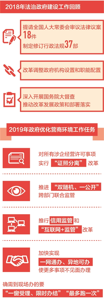 报告:国家层面重在制定统一的监管规则和标准,地方政府要把主要力量放在公正监管上。推进“双随机、一公开”跨部门联合监管,推行信用监管和“互联网+监管”改革,优化环保、消防、税务、市场监管等执法方式,对违法者依法严惩、对守法者无事不扰。