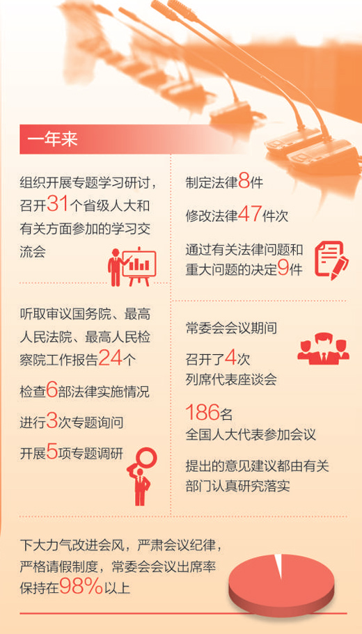 制定法律8件,修改法律47件次,通过有关法律问题和重大问题的决定9件;听取审议国务院、最高人民法院、最高人民检察院工作报告24个,检查6部法律实施情况,进行3次专题询问,开展5项专题调研……十三届全国人大常委会履职一年来亮眼的成绩单引人关注。