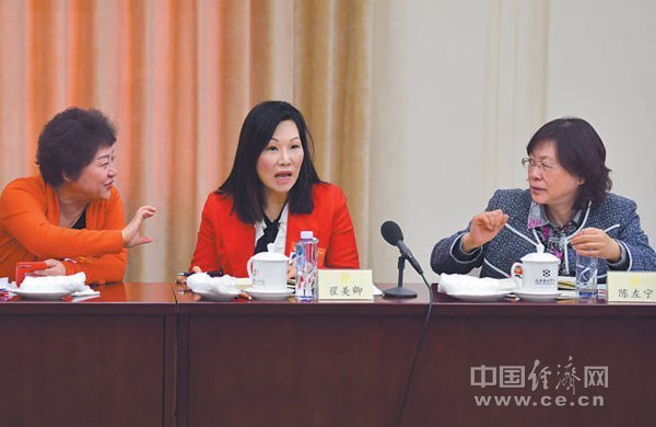 3月10日,全国政协妇联界别在驻地举行小组会议。会前,全国政协委员臧红、翟美卿、陈左宁(从左至右)就粤港澳大湾区建设展开讨论。翟美卿委员认为,粤港澳大湾区发展给相关城市和企业发展带来了新机遇。 经济日报-中国经济网记者 高兴贵摄
