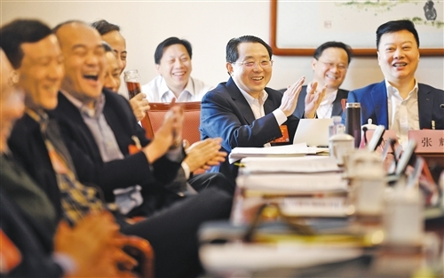3月14日上午,人大湖北代表团小组会议结束后,全国人大代表,湖北省长江产业投资集团有限公司党委书记、董事长何大春(中)与同团代表热议外商投资法草案。 经济日报-中国经济网记者 李景录摄