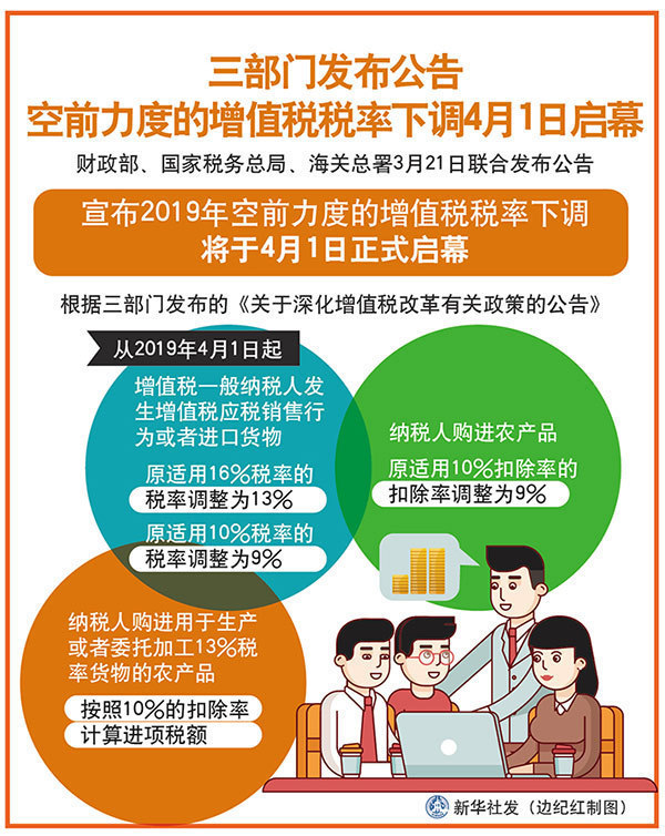 新华社北京3月21日电(记者申铖、郁琼源)财政部、国家税务总局、海关总署21日联合发布公告,宣布今年空前力度的增值税税率下调将于4月1日正式启幕,并公布了一系列深化增值税改革的配套举措。