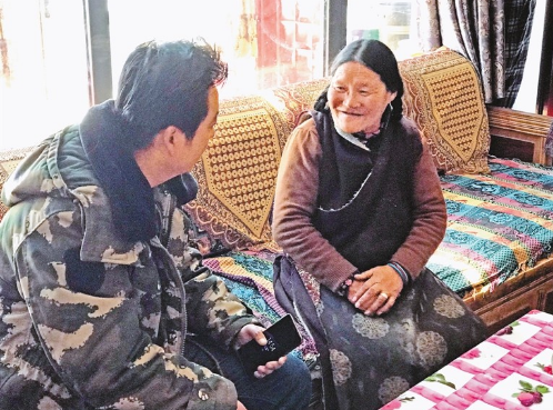 2015年底,青饶老人被认定为建档立卡贫困户,与之结对的是古露镇镇长崔国庆。虽然崔国庆结对帮扶青饶一家的工作早在一年前就结束了,但崔国庆一直惦记着青饶老人,常常去家中看望慰问。图为崔国庆(左)与青饶老人拉家常。记者 王晓莉 谢伟 通讯员 王利均 摄