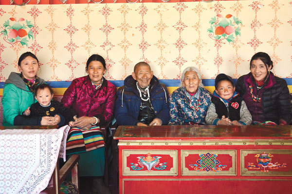 左图为次旦(右三)一家人合影。记者 汪纯 摄