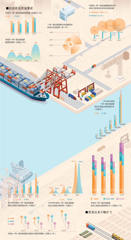 目前,我国已与126个国家和29个国际组织签署“一带一路”合作文件,“六廊六路多国多港”合作为主线的硬联通国际合作不断深入。我国企业在“一带一路”沿线国家建设了一批境外经贸合作区,累计投资超过300亿美元,带动东道国就业近30万人,给当地普通民众带来实实在在的获得感。2013年至2018年,我国与“一带一路”沿线国家货物贸易总额超过6万亿美元,我国企业对“一带一路”沿线国家直接投资超过900亿美元。
