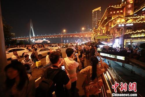 图为“五一”小长假期间,游客在重庆洪崖洞景区观光游玩。中新社发 苏自刚 摄