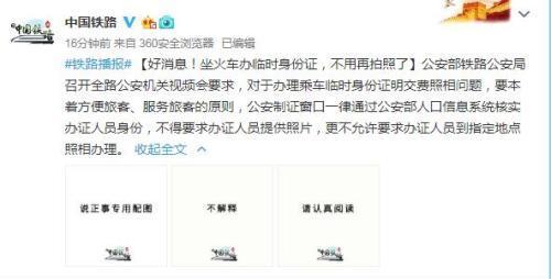 中国铁路总公司客运管理处有关负责人也表示,已对全国所有铁路客服人员进行培训,下发了培训要求,培训到每一个人,在回答旅客咨询时明确告知办理临时身份证不再需要拍照片。同时,对问题的知识库也进行了更新,“如果新来的铁路客服人员不清楚,检索关键词也可以正确回复。”