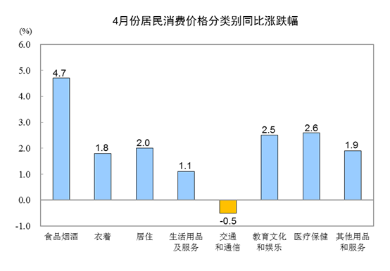 4月份,食品烟酒价格同比上涨4.7%,影响CPI(居民消费价格指数)上涨约1.40个百分点。其中,鲜菜价格上涨17.4%,影响CPI上涨约0.43个百分点;鲜果价格上涨11.9%,影响CPI上涨约0.22个百分点;畜肉类价格上涨10.1%,影响CPI上涨约0.42个百分点(猪肉价格上涨14.4%,影响CPI上涨约0.31个百分点);禽肉类价格上涨5.0%,影响CPI上涨约0.06个百分点;鸡蛋价格上涨2.6%,影响CPI上涨约0.01个百分点;粮食价格上涨0.4%,影响CPI上涨约0.01个百分点;水产品价格下降1.4%,影响CPI下降约0.03个百分点。
