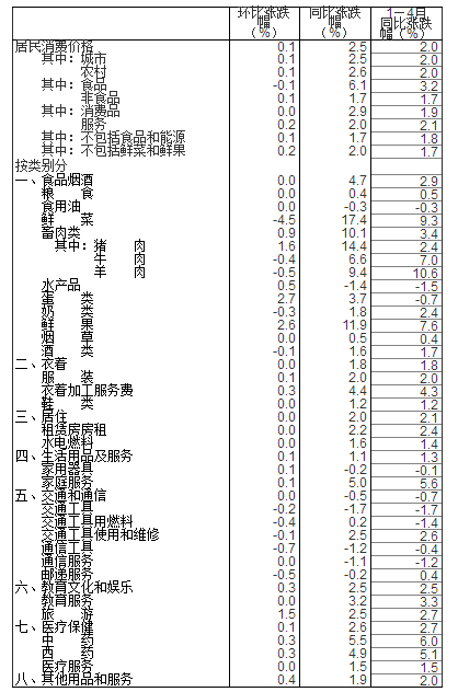 4月份,全国居民消费价格环比上涨0.1%。其中,城市和农村均上涨0.1%;食品价格下降0.1%,非食品价格上涨0.1%;消费品价格与上月持平,服务价格上涨0.2%。