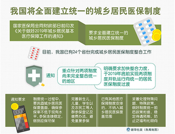 新华社北京5月13日电(记者张泉)国家医保局会同财政部日前印发《关于做好2019年城乡居民基本医疗保障工作的通知》,要求全面建立统一的城乡居民医保制度。