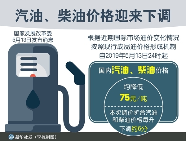 新华社北京5月13日电(记者安蓓)国内汽油、柴油价格将迎来下调。国家发展改革委13日发布消息,根据近期国际市场油价变化情况,按照现行成品油价格形成机制,自2019年5月13日24时起,国内汽油、柴油价格每吨均降低75元。