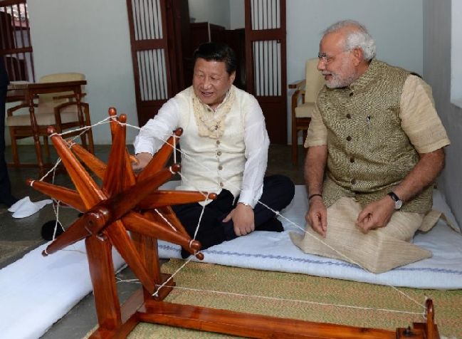 2014年9月17日,国家主席习近平在印度古吉拉特邦进行访问。印度总理莫迪全程陪同。这是习近平在参观甘地故居时,亲自摇动甘地曾经使用过的纺车。新华社记者马占成摄