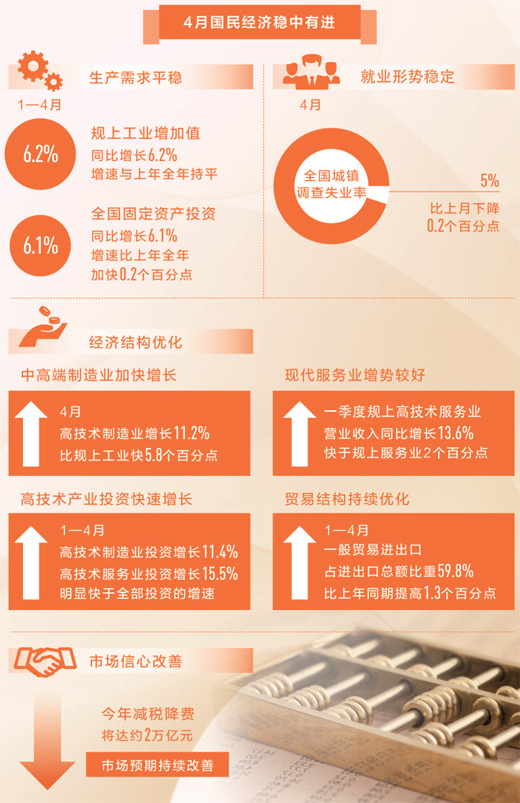 “判断经济形势还是要把这些短期因素过滤掉。从前4个月整体经济运行来看,总体平稳、稳中有进这个态势是没有改变的。”刘爱华说,在经济运行平稳的同时,经济结构继续优化。