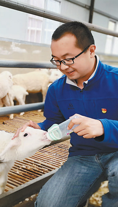 杨亚波在喂羔羊。人民日报记者 付 文摄