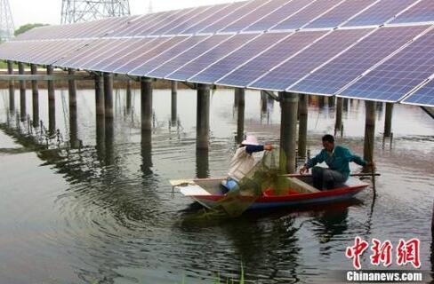 中国节能渔光互补项目 农户正在捕捞小龙虾