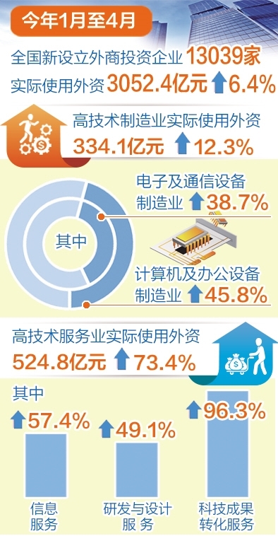 实际使用外资增速快。今年1月份至4月份,全国新设立外商投资企业13039家。其中,制造业实际使用外资943.8亿元人民币,同比增长11.4%,保持较高增速。