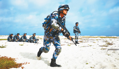 官兵们在白沙滩上进行战术训练。
