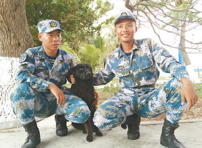 中建岛的“新兵”与他们喜爱的“小黑”在一起。