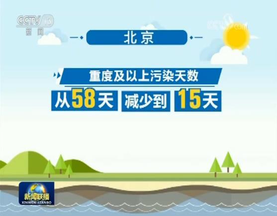 2018年首批实施新《环境空气质量标准》的74个城市,PM2.5平均浓度下降42%,二氧化硫平均浓度下降68%。京津冀、长三角和珠三角3个重点区域PM2.5平均浓度分别比2013年下降了48%、39%和32%。北京自2013年以来,PM2.5浓度大幅下降,重度及以上污染天数从58天减少到15天。