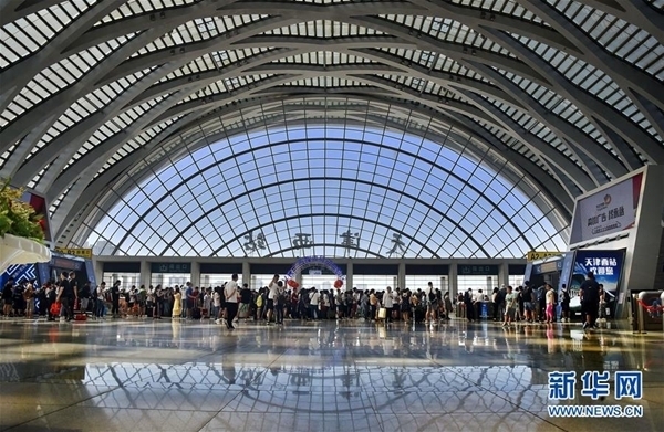 6月9日,旅客在天津西站候车大厅排队等候。据悉,全国铁路9日迎来端午小长假返程客流高峰,预计发送旅客1370万人次,加开旅客列车889列。新华社发(杨宝森 摄)