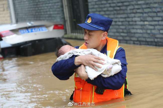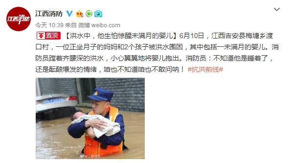 6月10日,江西吉安县梅塘乡渡口村,一位正坐月子的妈妈和2个孩子被洪水围困,其中包括一未满月的婴儿。消防员蹚着齐腰深的洪水,小心翼翼地将婴儿抱出。