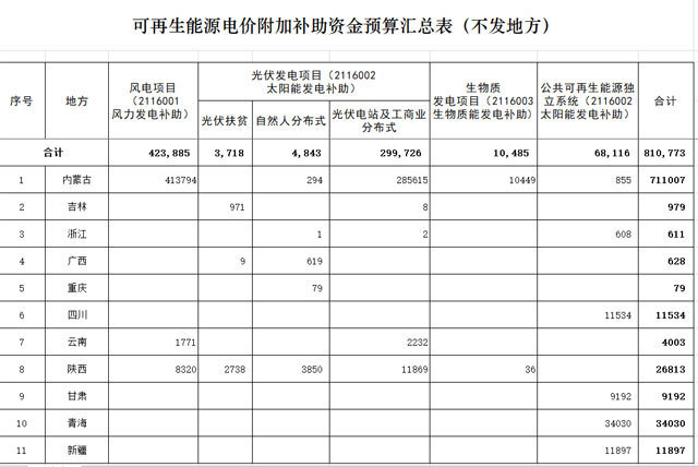 根据《通知》所附的《可再生能源电价附加补助资金预算汇总表》,风电、光伏项目补贴约为42亿元以及30.8亿元。其中,光伏扶贫、自然人分布式和光伏电站及工商业分布式分别为0.37亿元、0.48亿元和29.97亿元。其中,内蒙古各类可再生能源补贴合计71亿元,占比近九成,位居第一。