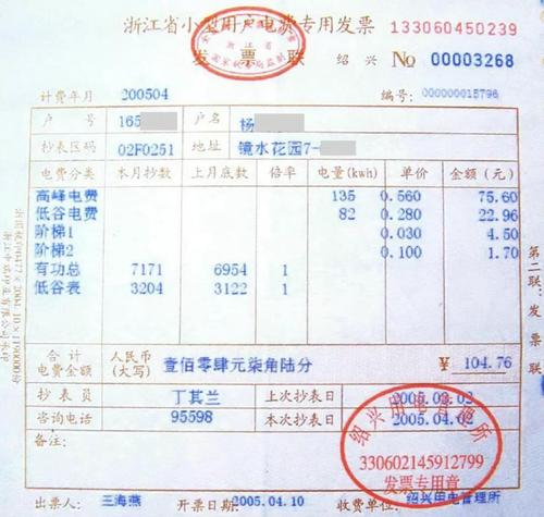 1997年5月,浙江市区居民照明到户电价调整为0.53元,之后基本保持在这个价格上下。这张发票是2005年的,用电量峰谷合计217度,加上阶梯累进电价后电费为104.76元,平均每度为0.482元。