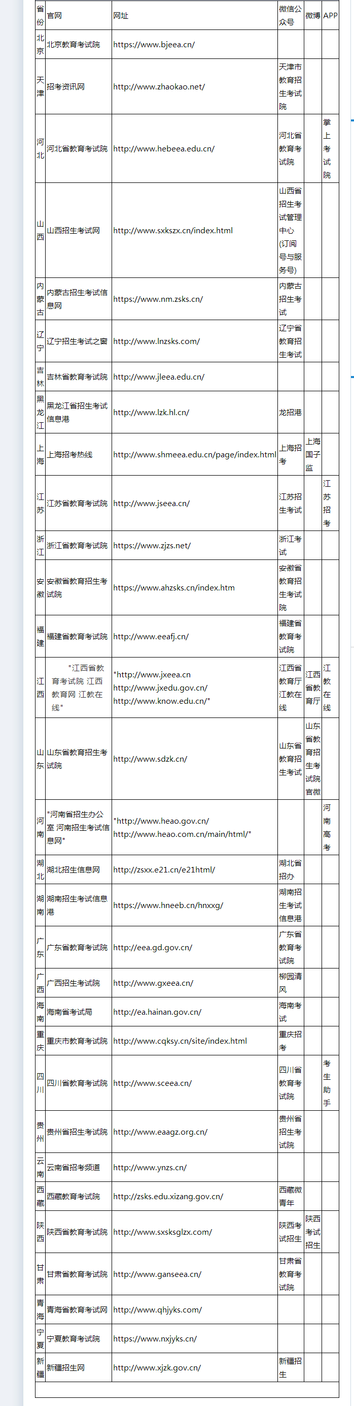 全国31省招办社交平台账号汇总表