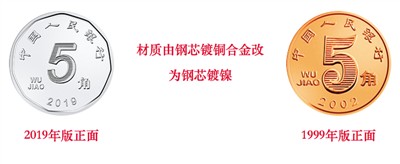 中国印钞造币总公司告诉记者,首先,由钢芯镀铜合金改为钢芯镀镍,硬币的抗变色性能将明显提升;其次,1999年版第五套人民币5角硬币采用的钢芯镀铜合金生产工艺,根据国家产业政策,属于拟淘汰的落后工艺,故不再使用。