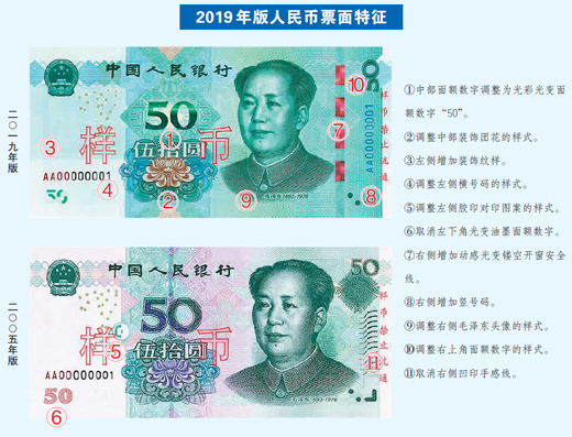据中国印钞造币总公司介绍,在现行第五套人民币纸币(2005年版50元、20元、10元纸币,1999年版1元纸币)防伪技术基础上,2019年版第五套人民币50元、20元、10元纸币也都增加了光彩光变面额数字,拥有了“亮晶晶”的效果。