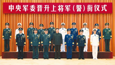 晋衔仪式在嘹亮的军歌声中结束。随后,习近平等领导同志同晋升上将军衔警衔的军官警官合影。