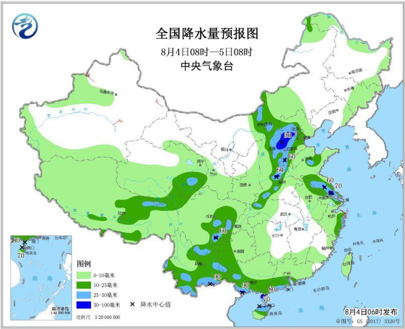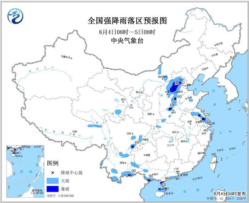 预计,8月4日08时至5日08时,内蒙古中部、山西东部、河北中西部、河南西部、江苏、云南南部、四川盆地西南部、广西南部、广东西南部以及海南岛等地的部分地区有大到暴雨(50~90毫米)。上述部分地区伴有短时强降水等强对流天气,局地有雷暴大风等强对流天气。中央气象台8月4日08时发布暴雨预报(见图1)。