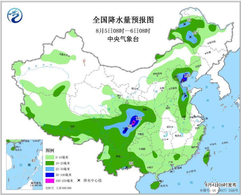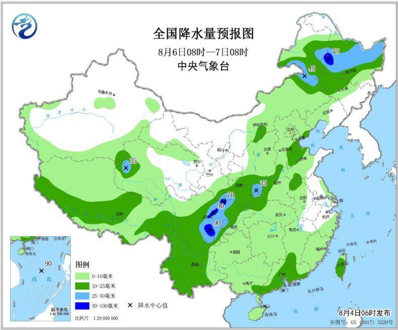 中新网8月4日电 中央气象台天气预报显示,受低涡切变影响,未来三天,华北大部、内蒙古中东部、东北地区北部和四川盆地等地的部分地区有中到大雨,局地暴雨或大暴雨,并伴有短时强降水、雷暴大风等强对流天气。此外,受“韦帕”残留系统影响,云南南部和华南南部的部分地区仍有中到大雨,局地暴雨。