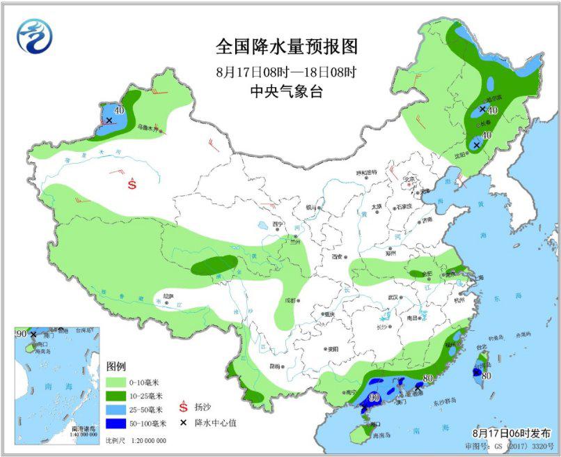 8月17日08时至18日08时,新疆北疆西部、东北地区中北部、华南中东部、台湾岛中南部等地的部分地区有中到大雨,其中,广西东南部、广东中南部及台湾岛西南部等地局地有暴雨(50~90毫米)。