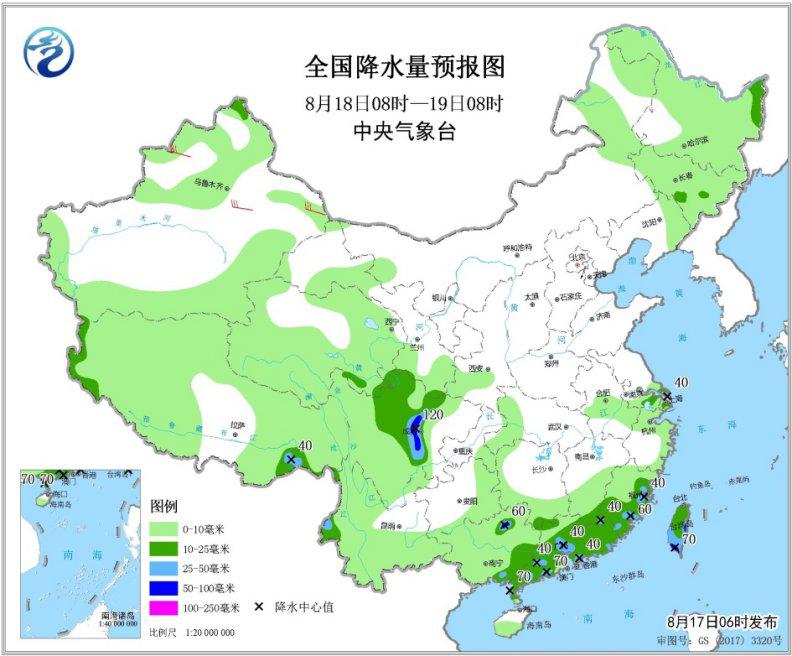 8月18日08时至19日08时,黑龙江东北部、江南东部、华南中东部、四川盆地西部、川西高原北部、台湾岛等地的部分地区有中到大雨,其中,四川盆地西部、广西东北部、广东西南部沿海、台湾岛南部等地局地有暴雨或大暴雨(100~120毫米)。