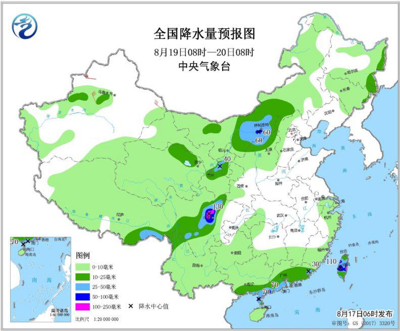 8月19日08时至20日08时,黑龙江东部、吉林东部、内蒙古西部、陕西北部、山西北部、青海北部、甘肃中部、四川西部和南部、云南西北部、华南中南部、台湾岛等地的部分地区有中到大雨,其中,内蒙古河套地区、四川盆地西北部、广东西南部沿海、台湾岛中部等地局地有暴雨或大暴雨(100~130毫米)。
