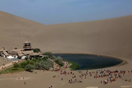游客在甘肃省敦煌市鸣沙山月牙泉景区游览。新华社发(张晓亮 摄)