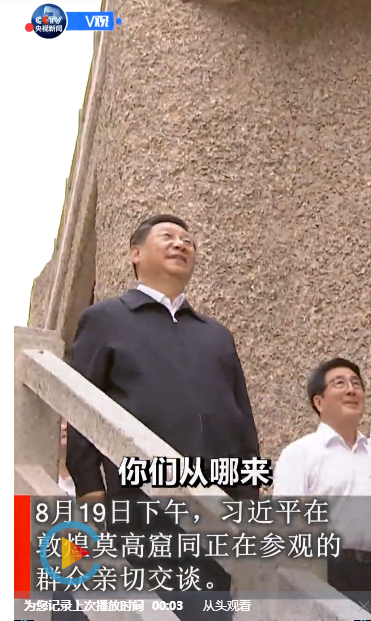 19日下午,正在甘肃考察的习近平总书记来到全国重点文物保护单位、世界文化遗产敦煌莫高窟。看到总书记来了,正在这里参观游览的群众激动地欢呼起来,纷纷向总书记问好。一位带着孩子自驾出行的游客从二层栈道探出头,他大声告诉总书记,他从江苏南通带孩子自驾过来。总书记招手笑道:“一路上可以看一看,孩子们可以长见识。”