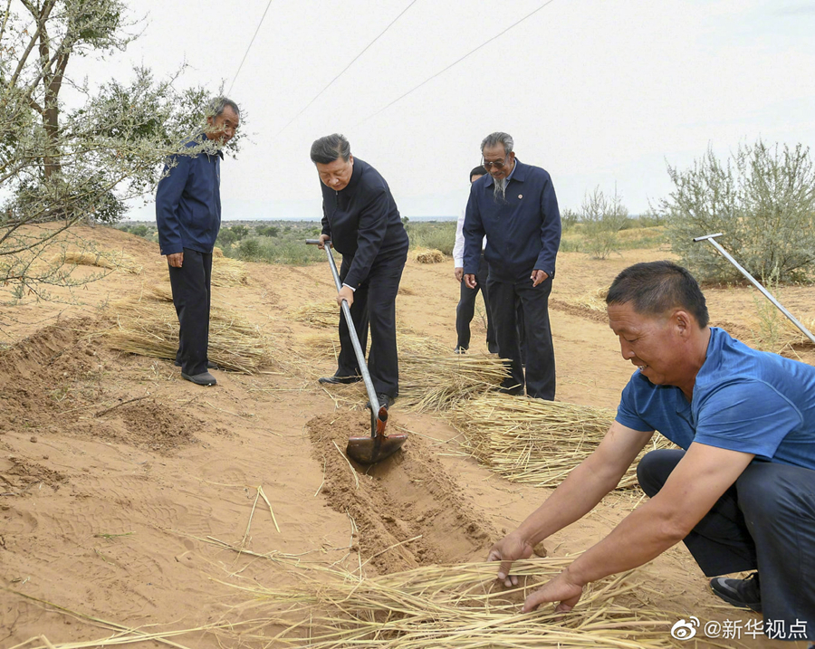 正在甘肃考察的习近平总书记,21日来到古浪县八步沙林场,察看林场风貌,听取武威市防沙治沙情况汇报和八步沙林场“六老汉”三代人治沙造林的感人事迹介绍,还拿起一把开沟犁,参与到治沙劳动中。习近平强调,我们要实现从富起来到强起来,就要把生态文明建设当作大事来抓,建设美丽中国。当前,生态文明观念日益深入人心,要继续发扬“六老汉”的当代愚公精神,再接再厉,再立新功,久久为功,让绿色的长城坚不可摧。(文字记者:张晓松、朱基钗 摄影记者:鞠鹏、谢环驰)