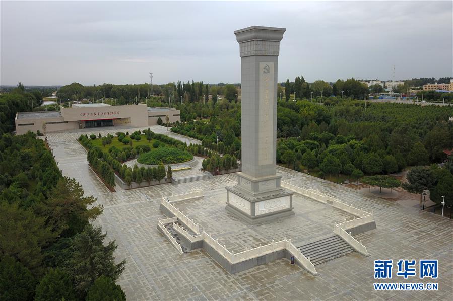 这是在张掖市高台县拍摄的中国工农红军西路军纪念碑和阵亡烈士公墓(8月21日无人机拍摄)。 新华社记者 范培珅 摄