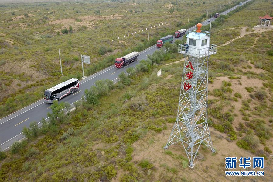 在武威市古浪县八步沙林场,场长郭万刚(左一)和大家一起前往治沙点(8月23日无人机拍摄)。新华社记者 范培珅 摄