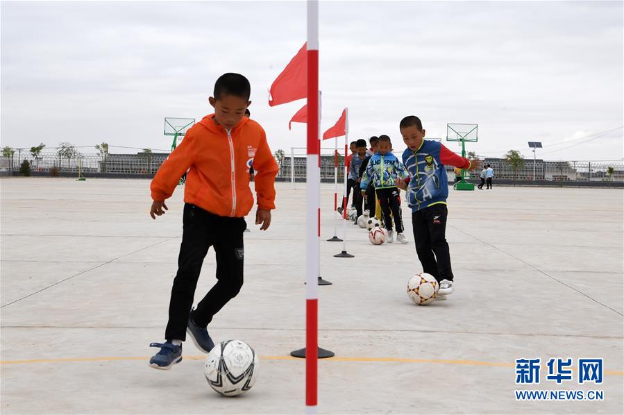 在武威市古浪县黄花滩生态移民区富民新村富民小学,足球兴趣小组的孩子们开展训练(8月22日摄)。新华社记者 范培珅 摄