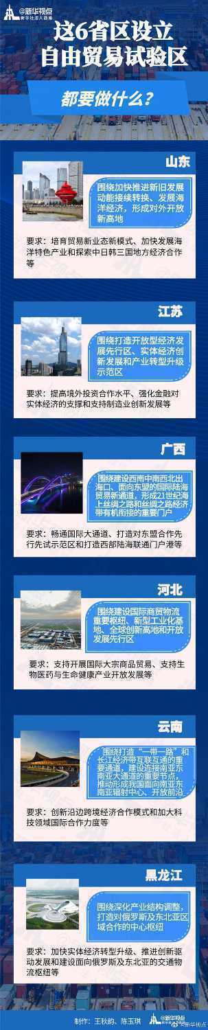 日前,国务院印发《中国(山东)、(江苏)、(广西)、(河北)、(云南)、(黑龙江)自由贸易试验区总体方案》,在6省区设立自由贸易试验区。这些自由贸易试验区,分别有哪些看点?来看