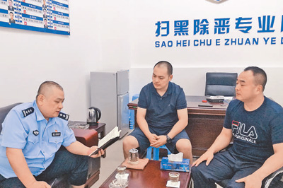杨春(左一)在扫黑除恶专业队布置相关工作。