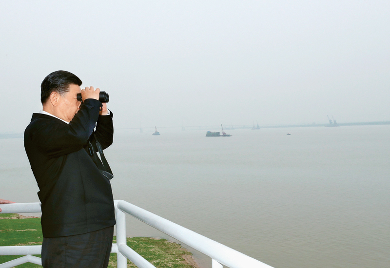 2018年4月26日下午,中共中央总书记、国家主席、中央军委主席习近平在武汉主持召开深入推动长江经济带发展座谈会并发表重要讲话。这是座谈会前,习近平于25日上午乘船沿江察看两岸生态环境和发展建设情况。 新华社记者 谢环驰/摄