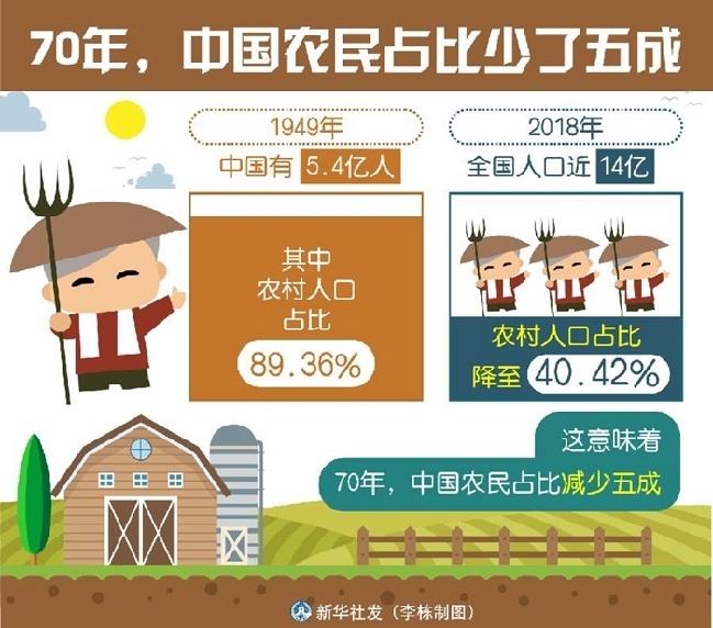 1949年中国有5.4亿人,其中农村人口占比89.36%;2018年,全国人口已近14亿,农村人口占比却降至40.42%。这意味着,70年,中国农民占比减少五成。
