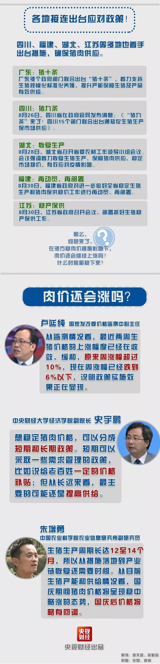 中国农业科学院农业信息研究所副研究员 朱增勇:从金融和保险方面进行了细化,譬如加强了生猪保险,提高了保险的额度,我觉得有利于减少养殖户对于疫病风险的顾虑,提高其补栏积极性。从短期的影响来看,像加大地方的冻猪肉收储,以及国庆前进行冻猪肉投放,对于抑制目前猪价过快上涨起到积极作用。